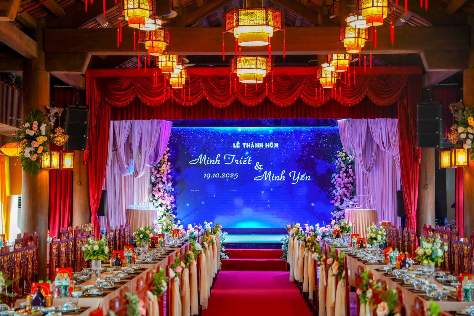 Không gian hội trường có thể được tùy biến theo yêu cầu, phối kết hợp sân khấu, cổng hoa, hệ thống đèn led, hiệu ứng khói – ánh sáng, v.v. đảm bảo mọi khoảnh khắc đều lộng lẫy & đúng tinh thần của bạn.