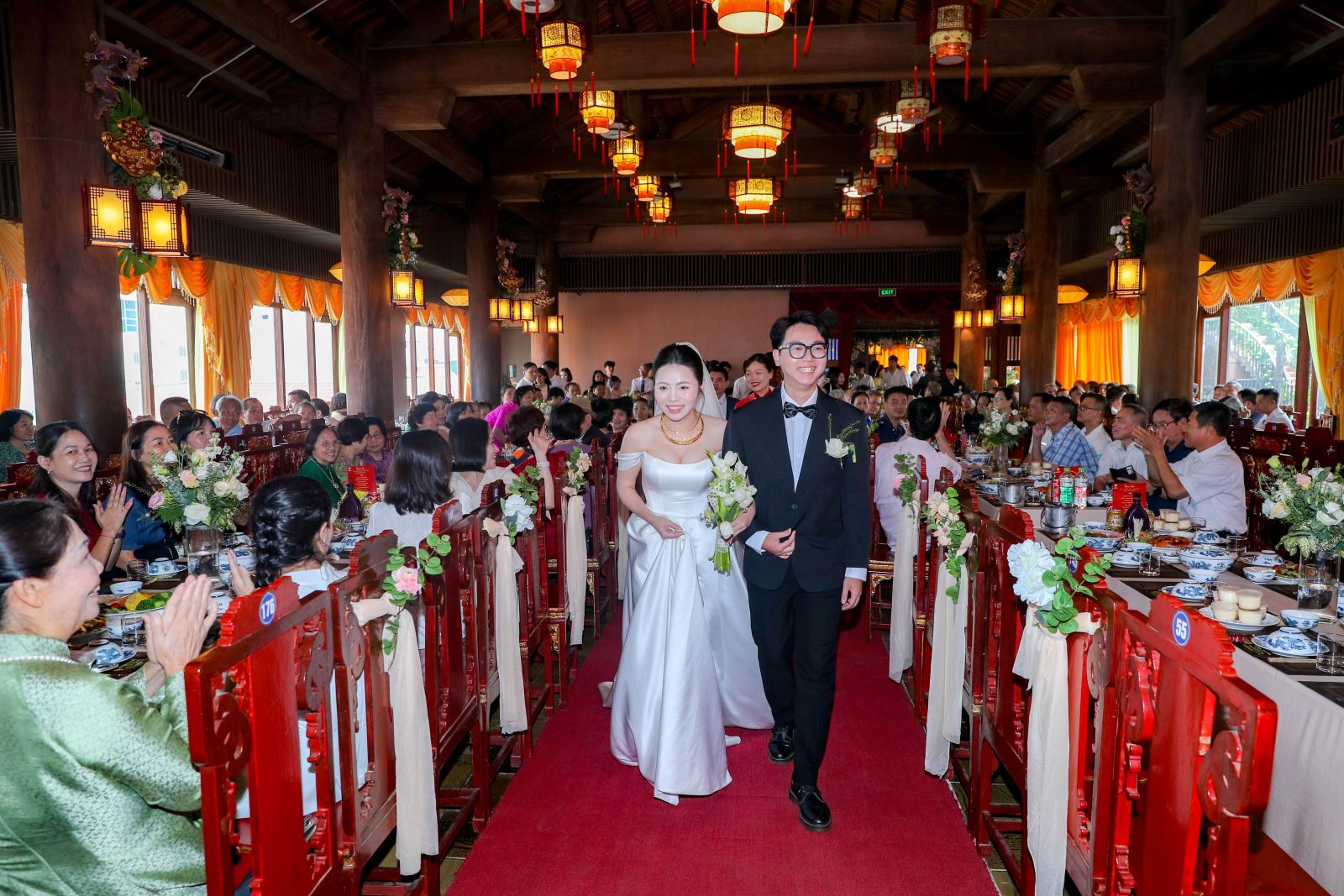 Bước vào Hội trường Cung Đình, bạn sẽ ngỡ như đang lạc vào một khung cảnh cung điện thời xưa. Tường gạch cổ, mái ngói cong, ánh sáng vàng ấm, và sân khấu trang trí theo phong cách cổ điển pha hiện đại – tất cả tạo nên một bầu không khí vương giả, thiêng liêng và lãng mạn.